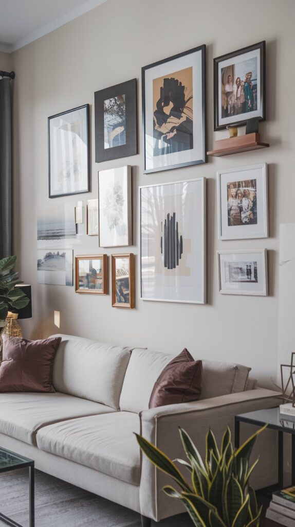 Creating a gallery wall is a fantastic way to make your living room feel personal and unique. It’s like turning your wall into a piece of art that tells a story about you, your family, or your style. Plus, it’s an affordable way to decorate!